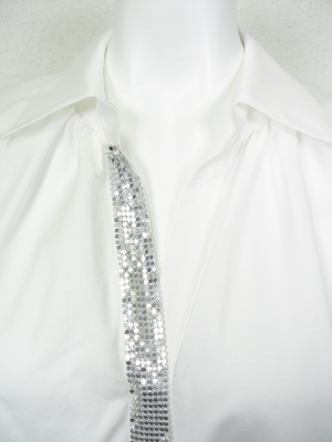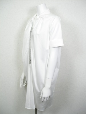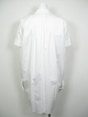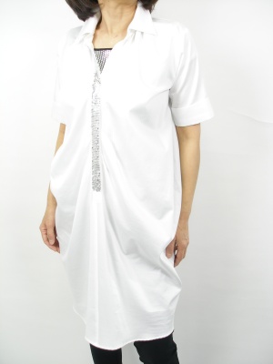 ビッグシルエットの白シャツ。シルバーのアクセントが効いています。スキニーパンツと合わせるとモードな印象。※ベルトは付いていません。