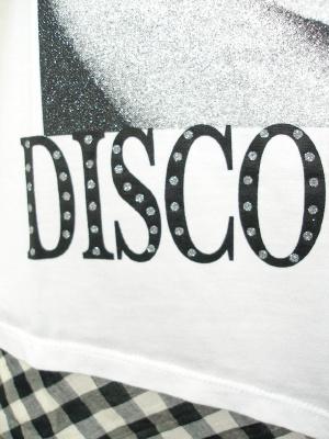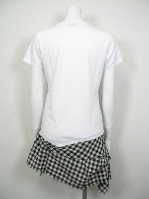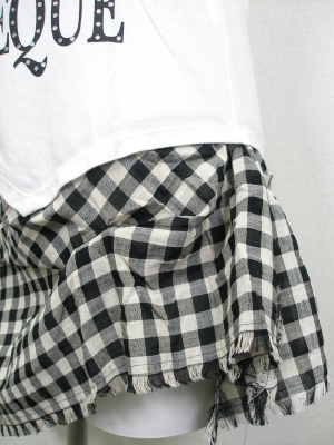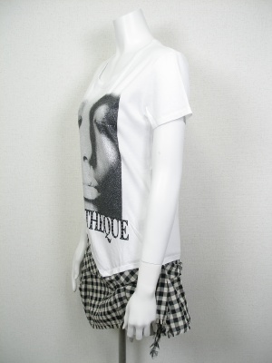 Tシャツとスカートを合わせたチュニック。顔プリントは全体にラメ入り。スカートはクシャッと無造作な感じで、ストールを巻いているようにも見えます。