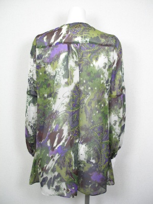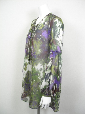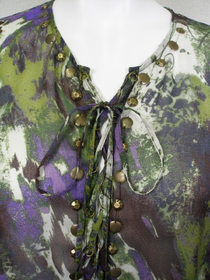 エスニックな柄のシフォンチュニック。前はレースアップで、ブロンズ色の装飾を手縫いしています。裏地なし(透けます)