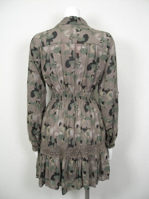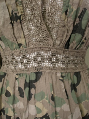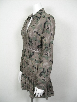 迷彩柄に見えて、よく見るとちょうちょが重なったプリントです。裏地がないのでレース部分は透けます。