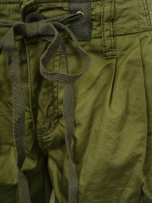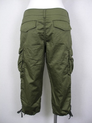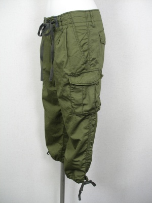クロップド丈のカーゴパンツ。タック入りで腰周りにゆとりがあり、裾はややすぼまったデザイン。裾の紐は少し絞ってリボン結びに。