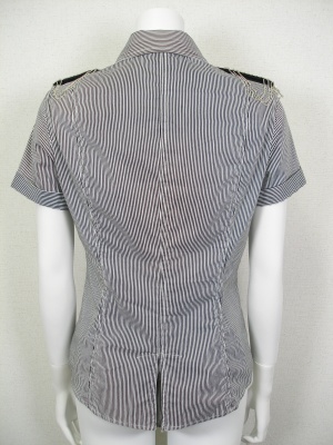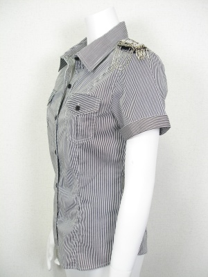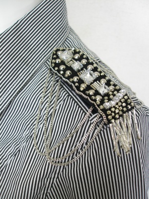 ストライプの細身シャツ。デコラティブな肩章がアクセント(取り外せます)。