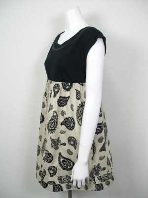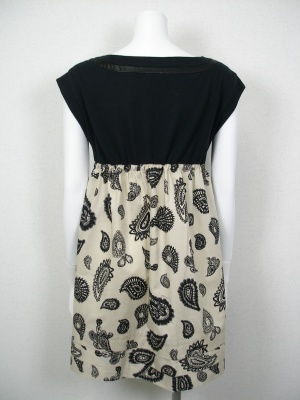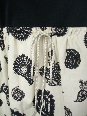 切り替え部分の紐を絞ってギャザーを調節します。ペイズリー柄ですがよく見るととぼけた顔があるポップなプリント。裏地なし。