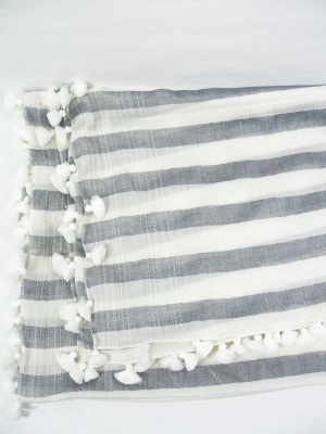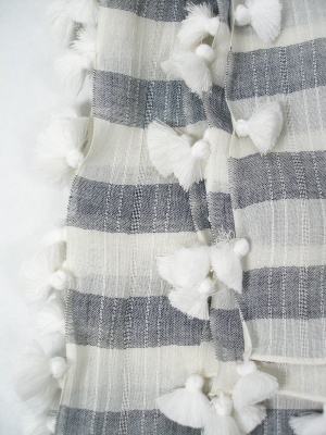 ポンポンのような房を周りに付けたボーダーストール。薄手で大判なので色んな巻き方が楽しめます。