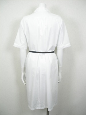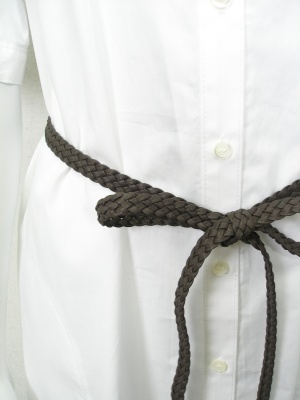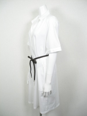 真っ白なシャツワンピース。付属のメッシュベルトでウエストマークして。裏地なし。