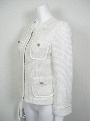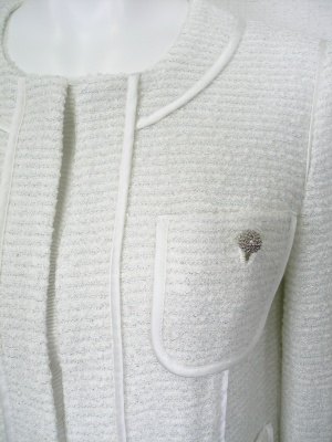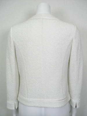 白地に白のサテンのパイピング、シルバーのボーダー柄。スナップボタン留め、裏地なし。見た目より薄く軽い素材の春夏用ジャケットです。