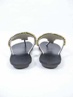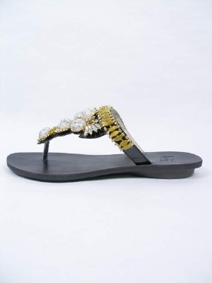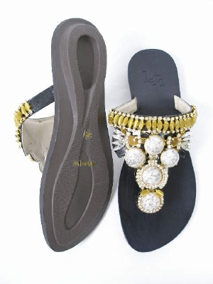 ビジュー付きトングサンダル。黒地に乳白色やイエロー、クリアの大振りビジューが印象的。金属部分はゴールド。