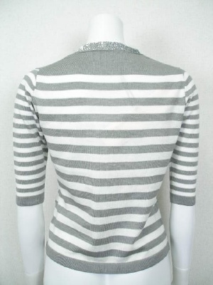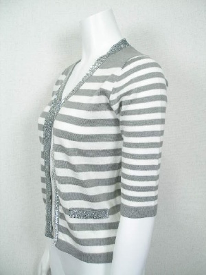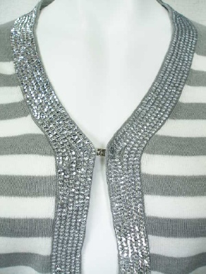 スパンコールでトリミングしたニットカーディガン。生地には引っかからないカギホックを使用しています。