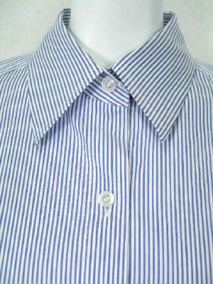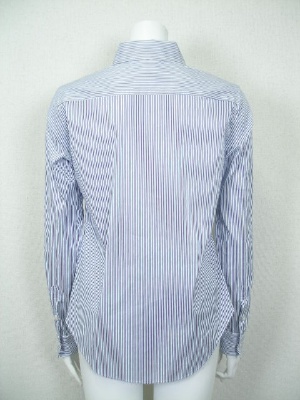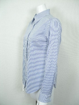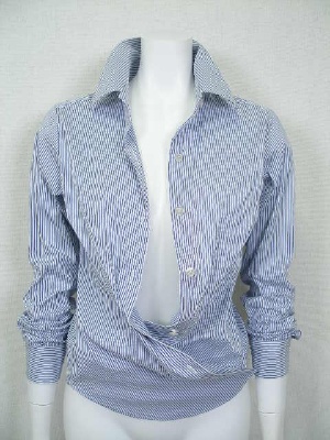 しトレッチの効いたストライプのシャツ。ID75615と同じ形で素材違い。両サイドの裾にボタンとボタンホールがあり、留めるとカシュクール風にアレンジできます。