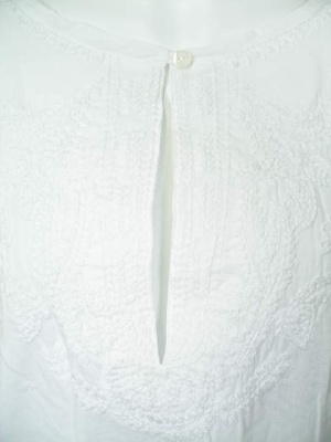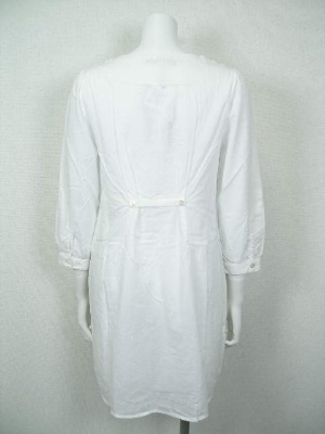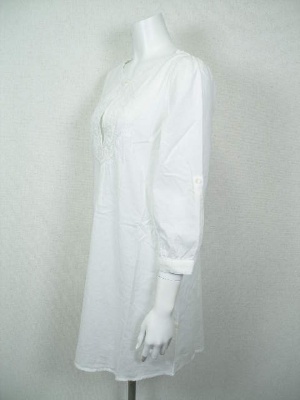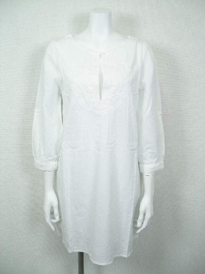 胸元に生地と同色の刺繍を入れたチュニックワンピース。共布のストール付き。素朴な風合いの綿素材です。裏地なし。カラー「ネイビー」は黒に近い紺色です。