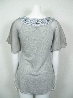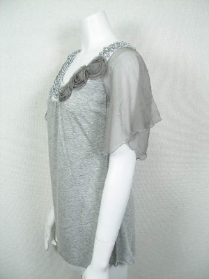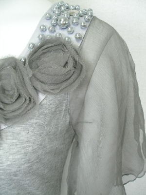 たっぷりとつけたシルバーの装飾が印象的なカットソー。ふわっとしたお袖はシルクのシフォンです。