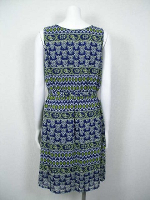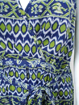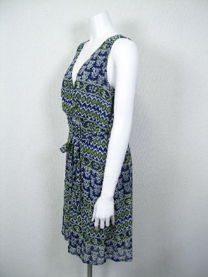 ネイビーにグリーンのエスニック柄の、シフォンワンピース。カシュクール風のデザインがスタイル良く見せます。全体に裏地付き。共布のベルトは外せます。