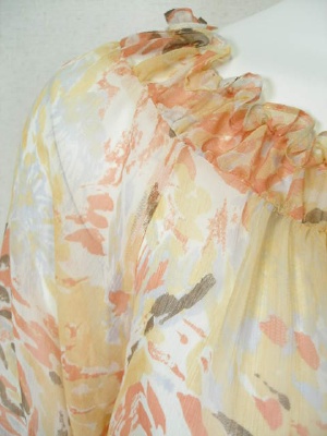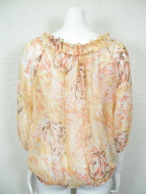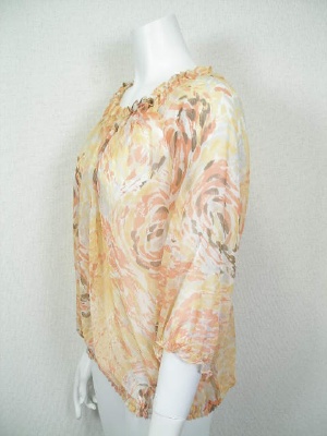 シフォンのふんわりブラウス。淡い水彩画のような大きめの花柄です。ネックライン、袖口、裾にゴム入り。