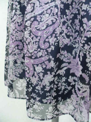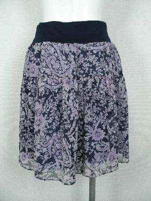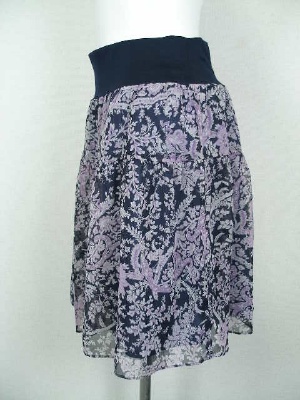 オリエンタルな花柄のシフォンがフェミニンなキュロット。スカートに見えますがパンツです。2色ともベースの色はネイビー。ウエストはゴム、裏地付き。