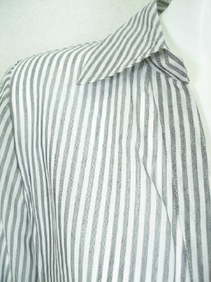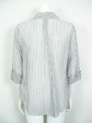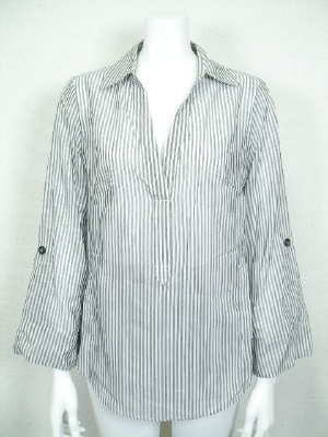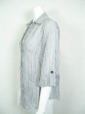 ややAラインのスッキリしたシャツ。お袖は伸ばすと幅がワイドな長袖に。サイズの「袖丈」はロールアップしてボタンで留めた状態。(写真一枚目)