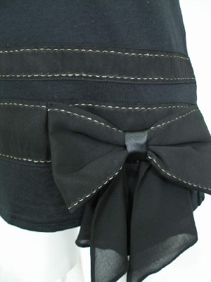 シフォンのリボンや小さめパフスリーブなど、甘いディテールの詰まったカットソー。広がりすぎないAラインでスッキリしたシルエットに。