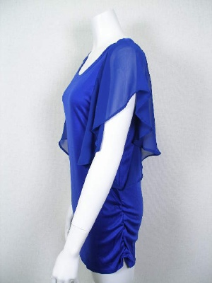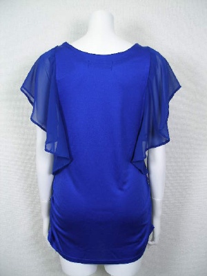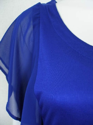 ノースリーブにポリエステルシフォンのヒラヒラ袖を付けたカットソー。身頃の両サイドにゴムを入れてギャザーを寄せています。