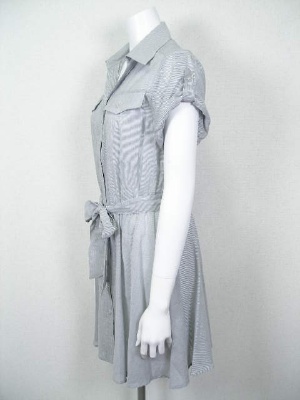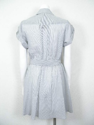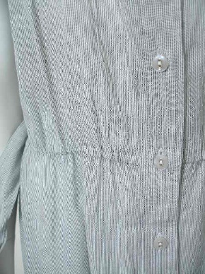 シャリッとした薄い綿素材の涼しげなシャツワンピース。白×グレーの細かいストライプ柄です。サイズの袖丈はロールアップした状態で測りました。伸ばすと袖丈は19.5cmに。裏地なし。