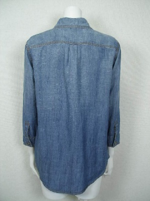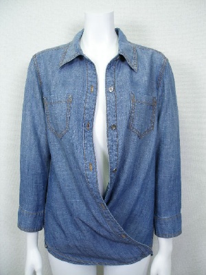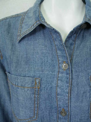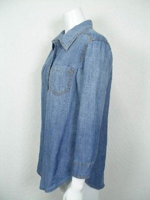 ややAラインのダンガリーシャツ。両サイドの裾にボタンとボタンホールがあり、留めるとカシュクール風にアレンジできます。