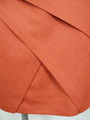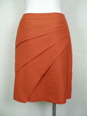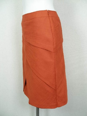 アシンメトリーに生地を重ねたタイトスカート。両脇が縫いどまっているので広がらす、スッキリしたシルエットに。裏地付き。