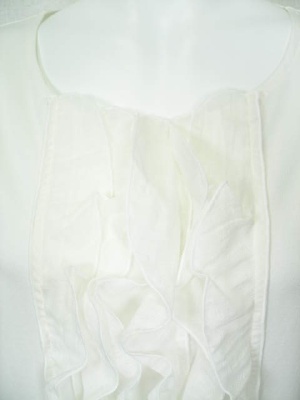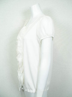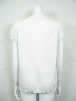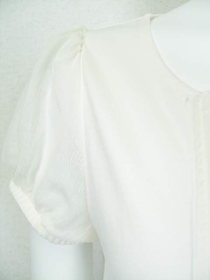フリルたっぷり、フェミニンなカットソー。お袖とフリルは布帛でほんのり透けます。袖口と裾にはゴムをいれ、ふんわりしたシルエットに。