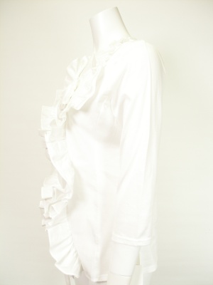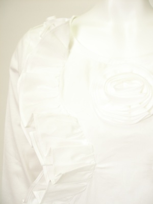 前身ごろは布帛を使い、フリルブラウスのように仕上げたカットソー。