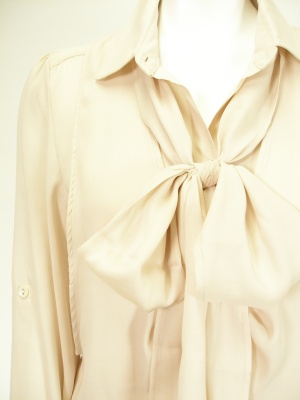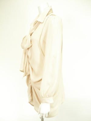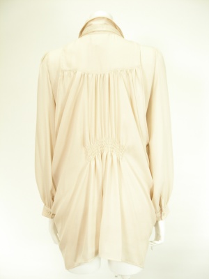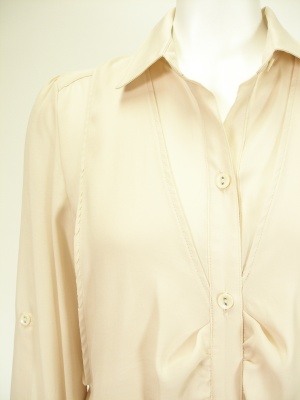 ゆったりしたシャツに同じ生地のドレープベストを重ねたデザイン。