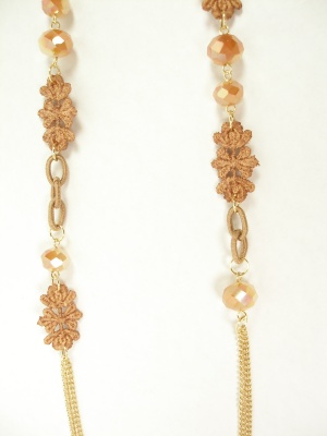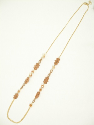 グラデーションカラーのグラスビーズとレースを、ゴールドのチェーンで繋げたロングネックレス。