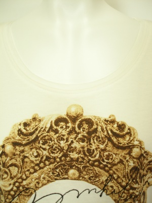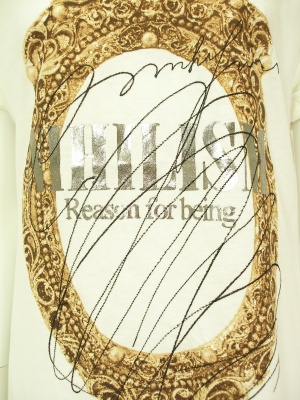 アンティークの鏡とシルバーロゴのプリント、その上に刺繍が施されています。
