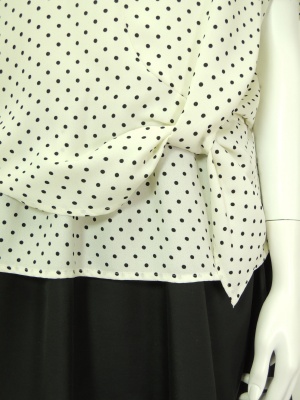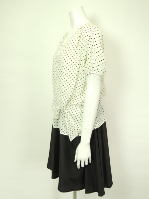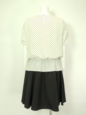 ドット柄のふんわりブラウスと、無地のフレアースカートとのトリックワンピ。