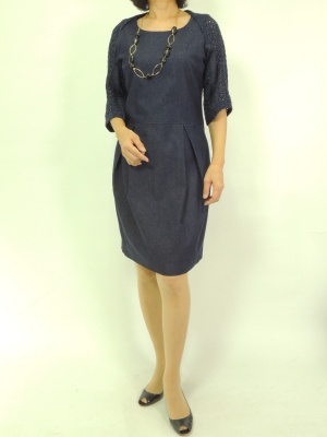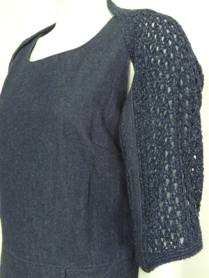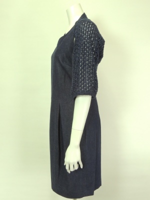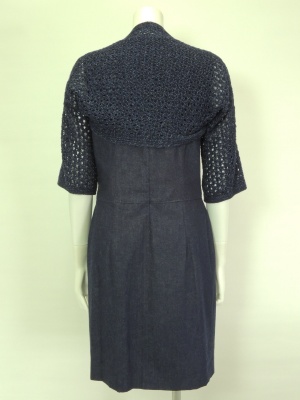 デニムワンピースとかぎ針ニットボレロの2点セット。