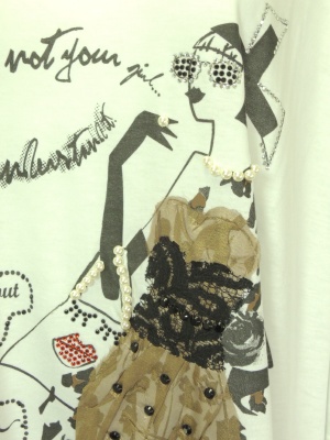 オシャレした女の子のプリントに別生地やビーズ、ラインストーンでコラージュしています。