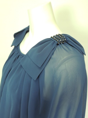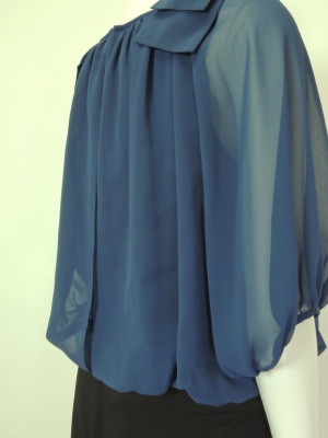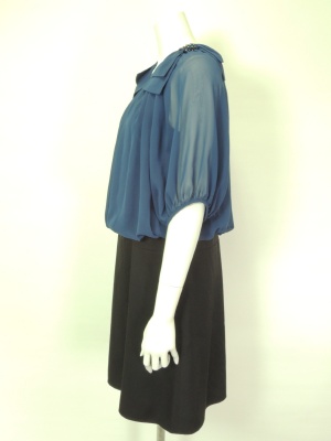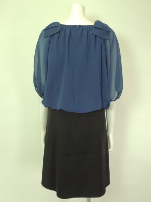 シフォンブラウスと黒のスカートの上品なトリックワンピ。