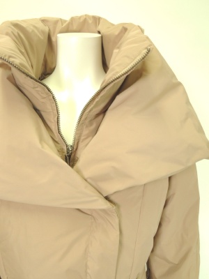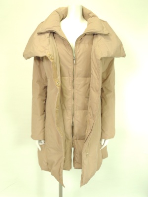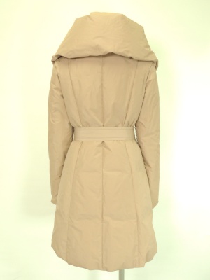 大きな襟と絞ったウエストがエレガントな印象のダウンコート。