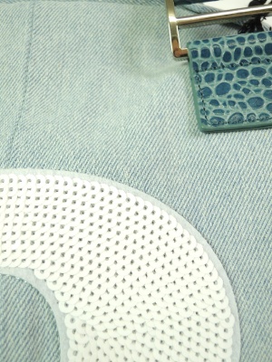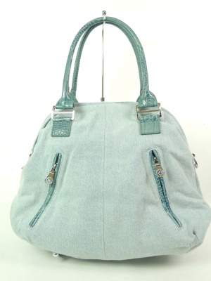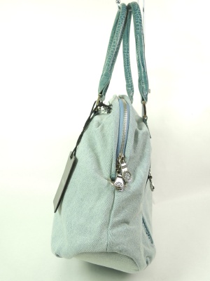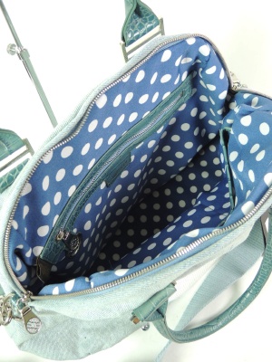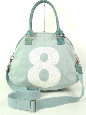 淡いブルーデニムを使用したmuta(ムータ)のバッグです。スパンコールで描いたラッキーナンバーの「8」がポイントで、中は鮮やかなドット柄。ショルダーストラップ付属。