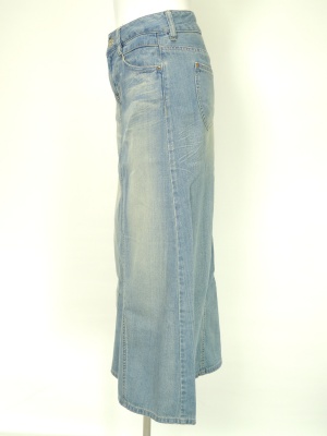 ユーズドっぽく仕上げたライトオンスデニムのリメイク風ロングスカート。ゆるく穿くタイプですので大きめに仕上げています。製品洗いの為、サイズに多少の個体差があります。