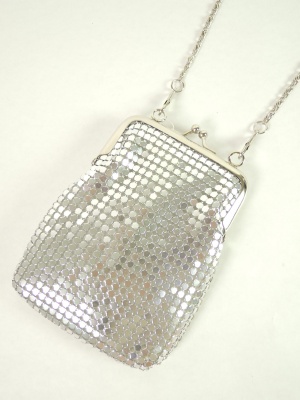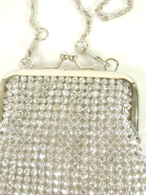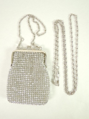 グラスビーズがキラキラ輝くがま口ポーチ。長さが37cmと60cmのチェーンが付属します。