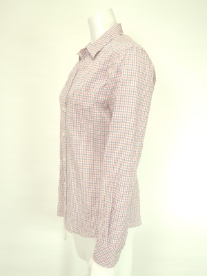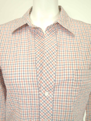 シワ加工で軽い素材感のチェックシャツ。上の方のボタンはなく、首元をスッキリ見せるデザインです。