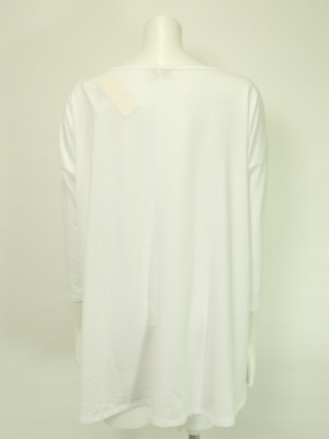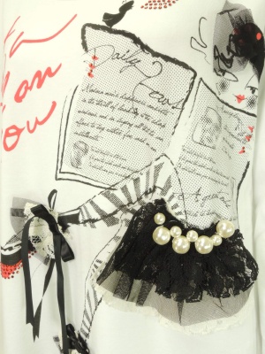 プリントの上にレースやシフォン、ビジューなどをコラージュした、ビッグシルエットのカットソー。