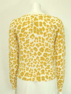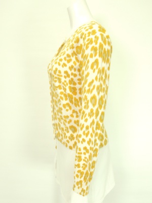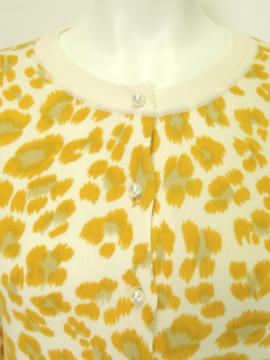 パールボタンのレオパード柄ニットカーディガン。