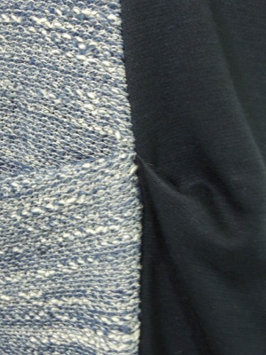 前身頃は表示の通りで、後ろ身頃はポリエステル65%レーヨン35}%のカットソー生地。