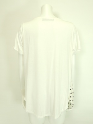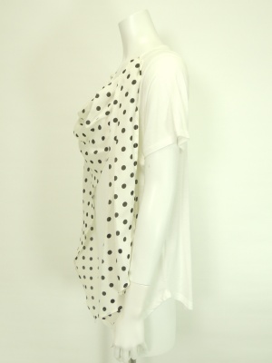 白のカットソーにオフホワイト×黒ドットの異素材(ポリエステル)を重ねたデザイン。