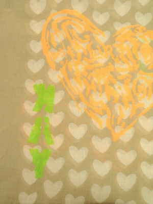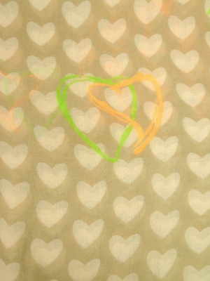 小さなハート柄にネオンカラーの手書き風のハートを重ねています。