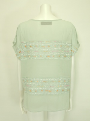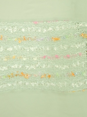 ファンシーな色使いのニットとシフォンをボーダー状に切り替えたブラウス。