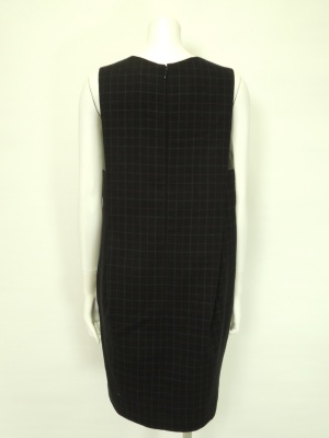 脇のフェイクレザーや、前上がりですぼませた裾のデザインが個性的な印象。