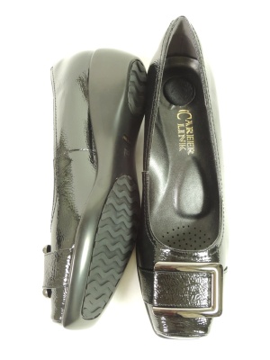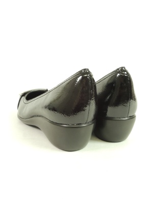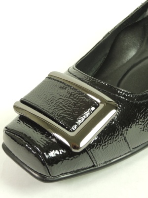 エンボスの型押しを施したとても柔らかい本革エナメルにバックルをあしらったパンプス。