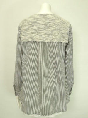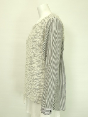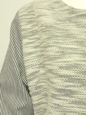 表面に凹凸のあるパイル状の生地とストライプのシャツ生地との組み合わせ。
