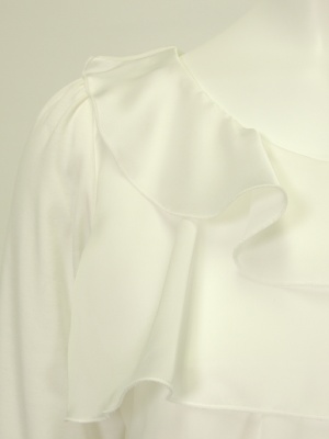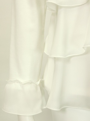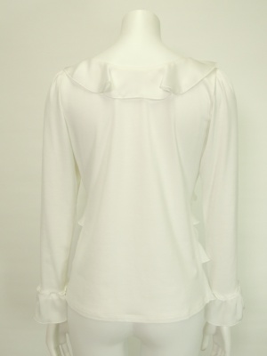ストレッチの効いたカットソーの前身頃と袖口に異素材(ポリエスレル)のフリルを付けています。