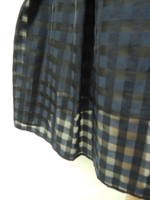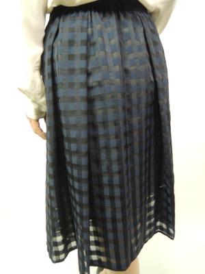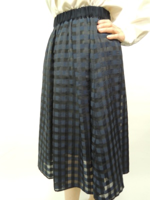 ウエストゴム、ギャザースカート 裏地有、表の生地はあえて長めにして透け感を活かすデザイン。大きなギンガムチェック柄が印象的、ウエストゴムで2サイズ展開