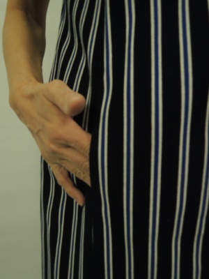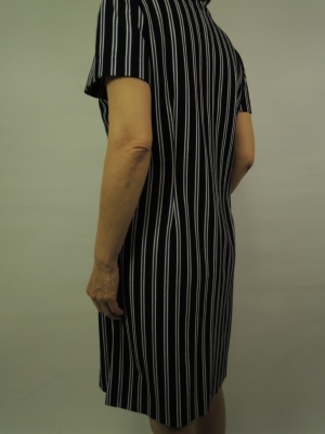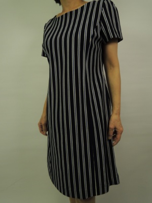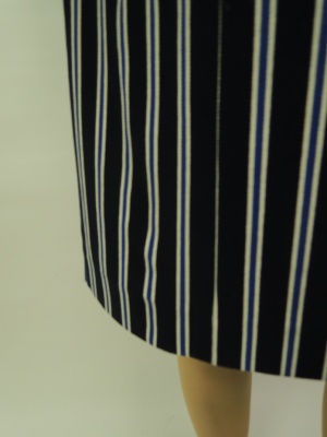 ストライプ柄の生地、タイトシルエットのワンピ、後ろファスナー、ペチコート付き